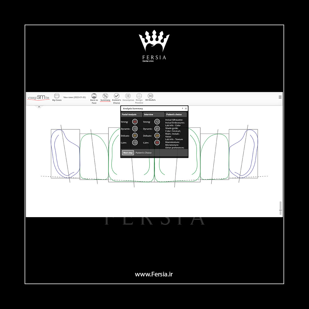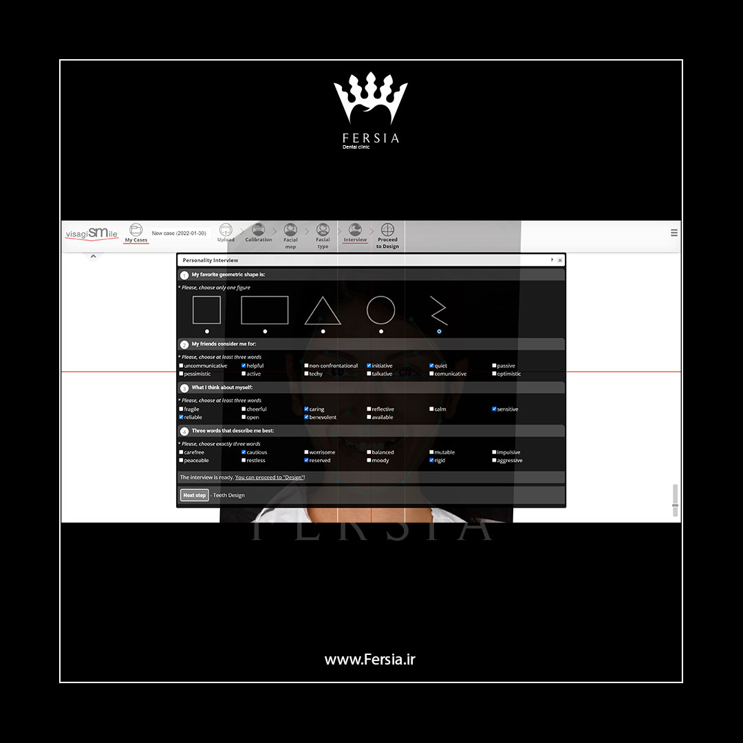 آنالیز صورت بیمار ارزیابی تیپ شخصیتی بیمار(Personality Interview) طراحی دو بعدی لبخند بر اساس آنالیز صورت و تیپ شخصیتی بیمار تست فرم لمینیت ها در دهان بیمار با مواد کامپوزیتی موقت نمای نزدیک لبخند بیمار نمای طبیعی لمینیت ها نتیجه نهایی